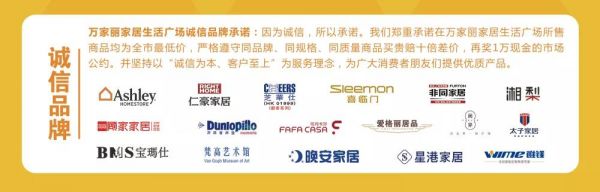 温馨提醒:消费者朋友们在购买家居产品时,请尽量选择有价格保障体系的知名市场进行选购,不轻信、不购买异常低价的产品,核算好整体价格。万家丽家居生活广场“全市最低价”践行17年,入驻品牌均为厂家直营、省级代理商,敢于承诺买贵赔十倍差价,再奖励1万元现金。
