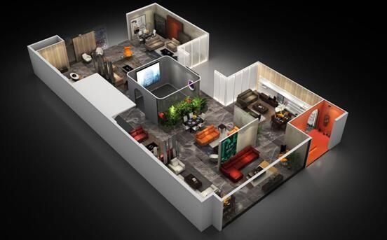 充分运用声、光、电、色彩等多维度体验,黑白色调的太空舱,红灰色调结合的动感空间,LED大屏,炫酷的3D投影、五感体验等,家居空间通过色彩的搭配、声光的炫酷,使整个空间的颜色和谐自然,展现出更为年轻时尚的家具空间形式,享受视觉和听觉的双重审美愉悦,自在悠游,沉醉其中。
