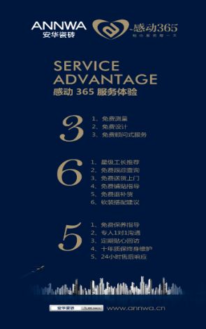 在产品同质化日益严重的形势下,优质的产品琳琅满目,优秀的销售服务花出百样,而生存之本的售后服务,定是销售成功核心价值观之一。安华瓷砖自品牌成立起就推出了感动365服务,每一项政策都是根据消费者角度进行完善,不仅全方位保障了消费者的权益,更能让消费者享受到增值福利,大大地增加了消费者对品牌的信心和忠诚度。
