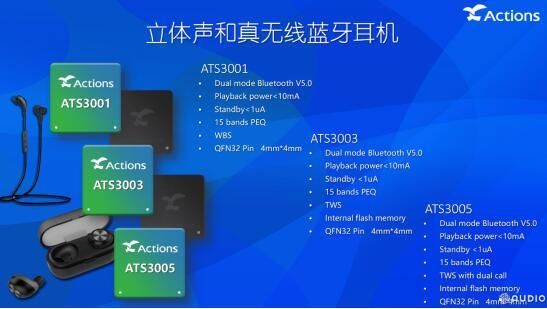 Actions炬芯还推推出的ATS3001、ATS3003、ATS3005这三款方案均支持蓝牙5.0双模,具有播放功耗小于10mA、待机功耗小于1μA的超低功耗的特点,参量均衡数目15 bands PEQ。其中ATS3001是挂式蓝牙耳机的方案,ATS3003、ATS3005为TWS真无线蓝牙音频方案。ATS3005最为强大,支持真无线蓝牙耳机双边通话功能。总的来说,Actions 炬芯ATS300X 系列新品内置150MHz MIPS32处理器,支持数字麦克风和模拟麦克风输入,内置18mW的立体声耳机放大器,支持蓝牙V5.0并且兼容蓝牙V2.1~V4.2。这款方案主打便携式蓝牙耳机产品,具有低功耗的特点,内置ROM和大容量RAM,可以在很大程度上满足不同蓝牙应用方案的需求。