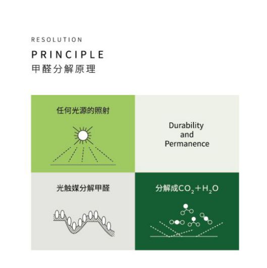 综上所述,简一降解甲醛技术具备四大核心优势:广谱,只要有光即可分解甲醛,无论是人工灯光还是自然光。高效,根据国家权威机构检测,48小时内的去除率达到90%。持久,简一研发的新型光触媒是催化剂,在分解甲醛的过程中不会被消耗,长期有效。安全,直接将甲醛分解成二氧化碳和水,过程不可逆,光触媒的主要成分为二氧化钛,在国际上都是食品医用级应用材料,可放心使用。