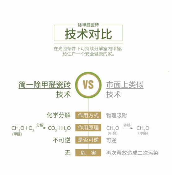与其他类似技术对比,简一除甲醛瓷砖使用的是化学分解技术,完全零危害,而市面其他技术使用的物理吸附技术则有一定的漏洞,只能吸附,不能分解甲醛,与此同时其吸附力有限,一旦吸附强度达到顶峰,反而会释放有害气体,再次造成二次污染。