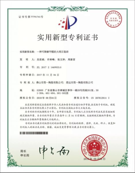 据了解,简一的除甲醛瓷砖技术已申请国家五项专利,其中“一种可降解甲醛的大理石瓷砖”已获实用新型专利。