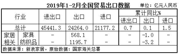 数据观市 | 国家海关总署:2019年前两月家具出口568亿元