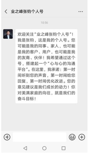 第一,董事长在线关怀,怀揣着一个企业家的真心。从1月22日开始,在微信上搜索“业之峰张钧”,就可以找到一个叫做“业之峰张钧个人号”的公众号,它就是业之峰集团董事长张钧的个人号。客户能够通过董事长的个人公众号,与张钧1对1沟通,了解业之峰动态。张钧表示,通过建立董事长个人公众号,能够直接得到客户的第一手信息,改进自己的短板,提高客户体验。他承诺:“会在这里第一时间听到您的声音,第一时间给您回复,第一时间优化改进。您的意见建议是我们成长的动力!你对美满家庭的向往,就是我们的奋斗目标!”