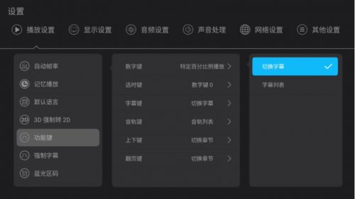 而全新版本固件,让这项体验更简化——在设置界面,利用遥控器的数字做玩家习惯的一键预设唤醒,其中一项便是将字幕选项用数字键一键唤出,包括字幕位移调整、字幕时间轴微调、字幕特效等玩法。