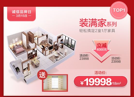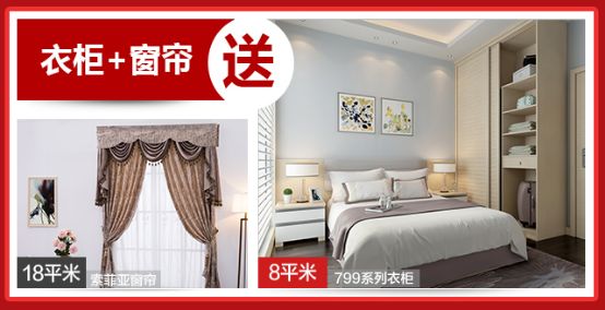 1、购18m²装满家套餐即送18m²价值2000元窗帘+8m²价值6392元趟门衣柜。