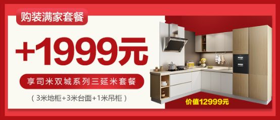 2、购18m²装满家套餐+1999元即送价值12999元司米橱柜一套。