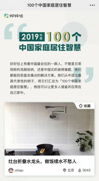 2019年3月16日,家居装修分享平台「好好住」在2019年梦想生活方式展上发布了「2019年度 100个中国家庭居住智慧」(以下简称“榜单”)。