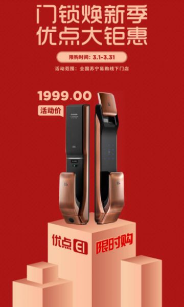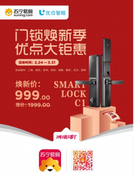“金三银四”装修旺季已然到来,为了适应消费者需求,苏宁易购不断地推陈出新,提升自身的服务品质,打造出2019春季家装节。与此同时,优点科技为了回馈广大消费者的信任和支持,将于3.1日–3.31日在苏宁易购线下门店进行#门锁焕新季,优点大钜惠# 活动。届时,优点智能锁性价比爆品E1、C1将限时限量发售,价格最高直降1000元!用最直接的行动和最优惠的价格,带给广大消费者新的体验。