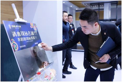 在展会现场,观众亲自尝试欧琳高端易清洁技术所带来的神奇效果。现场对比显示:没有应用易清洁技术的不锈钢,油污顽固附着在表面,很难以清洗,而应用了欧琳易清洁技术不锈钢,对于记号笔类似的顽固油污,用清水喷一喷,即可轻松擦洗干净。