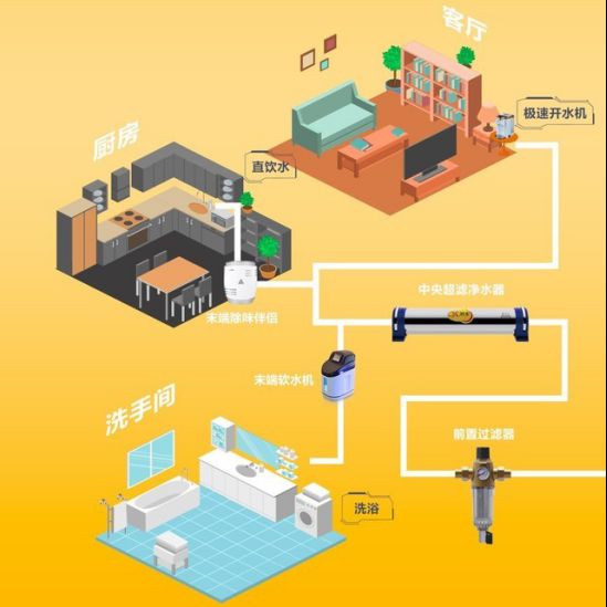 此外,大家还可以根据水质特点和特定的用水场景搭配相应的末端超滤伴侣,实现家庭分质供水,来满足大家个性化的水质需求。比如,在厨房加装末端除味伴侣,去除水中残余的异色异味,让饮水口感更加清甜爽口;在卫生间加装末端软水机,软化水质,让洗涤后的衣物更柔软,让洗浴后的皮肤更光滑娇嫩。