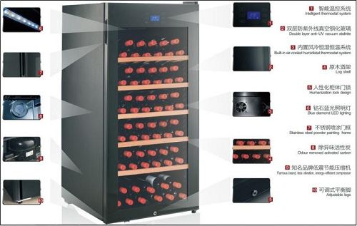 凯得电器所研产的电子红酒柜采用上好原木酒架,配置软垫以避免层架触碰酒柜内壁,在有效减震的同时,还能避免水珠滴到瓶体损害红酒标签;双层防紫外线真空钢化玻璃,可防止葡萄酒遭受紫外线损伤从而变质;柜体门锁设计人性化,方便开启柜门拿放红酒;柜体门框由不锈钢喷涂而成,不易生锈长期保持美观;钻石蓝光照明灯,可避免强光照射引起酒体变质;除异味活性炭,全面祛除空气异味,保持柜体内部气味清新;知名品牌低震节能压缩机,降低震动传递,使美酒安然沉睡;可调式平衡脚,维持柜体平衡,有效减少晃动;内置智能温控系统、风冷恒湿恒温系统,柔和控温、自动恒湿,保持最佳储酒环境。