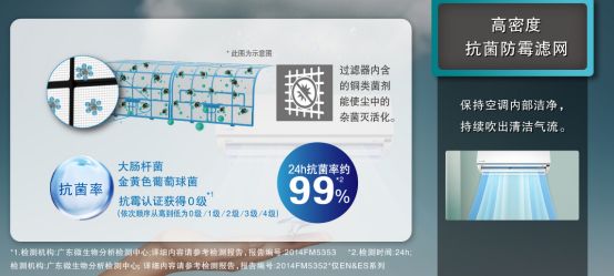 不仅如此,松下ES空调还能持续吹出清洁气流。松下为ES空调搭载了高密度抗菌防霉滤网。掀开空调面板,我们就能看到这块高密度抗菌防霉滤网,据松下官方数据显示,这块滤网24小时的抗菌率高达99%,过滤器内含的铜类菌剂能使尘中的杂菌灭活化。