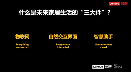 在联想集团副总裁阿木看来,智能产品在向智慧服务过渡的过程中,人们对生活的诉求已经发生改变,对于未来的人居环境来说,“物联网、自然交互界面、智慧助手”将成为改变居家生活标配的“三大件”,在这“三大件”的推动下,我们对于家居环境的探索将以用户体验为中心,上升到“多设备互联及协同感知、多模态自然交互、A.I.驱动的云边端融合服务”方面,当然了,这也是联想一直布局SIoT智能物联网,强调场景智能的初衷。