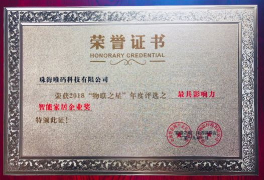 2019年伊始,近千位物联网CEO齐聚苏州,探讨万物智联,生态共赢的行业发展战略。本次大会上珠海唯码科技有限公司获得了中国最具影响力智能家居企业奖!