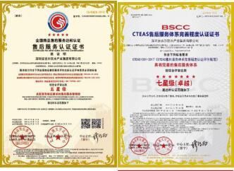CTEAS售后服务体系完善程度认证证书获得“七星级(卓越)”认证,为目前最高的售后服务认证等级。CTEAS七星级(卓越)售后服务认证是对企业售后服务体系完善程度评价的专业标准体系,在国家标准基础上提出了更高要求,获得证书的企业意味着不仅具有完善的售后服务体系,售后服务能力在国家处于一流水平。