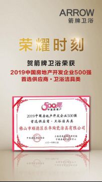 讯!箭牌卫浴荣膺2019「500强房企首选供应商·卫浴洁具类