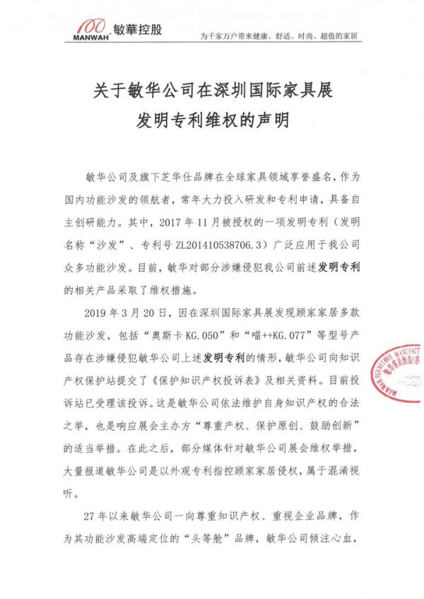 声明还指出,部分媒体针对敏华公司展会维权举措,大量报道敏华公司是以外观专利指控顾家家居侵权,属于混淆视听。