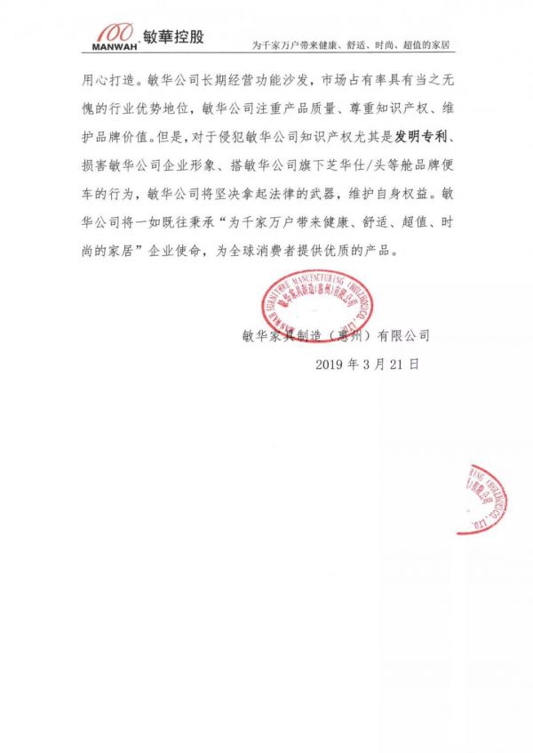 声明特别强调,敏华公司长期经营功能沙发,市场占有率具有当之无愧的行业优势地位,敏华公司注重产品质量、尊重知识产权、维护品牌价值。但是,对于侵犯敏华公司知识产权尤其是发明专利、损害敏华公司企业形象、搭敏华公司旗下芝华仕/头等舱品牌便车的行为,敏华公司将坚决拿起法律的武器,维护自身权益。