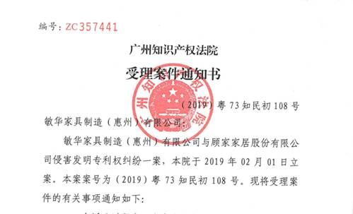 从广州知识产权法院网站查询获知,广州知识产权法院于2019年2月1日立案受理了敏华公司的起诉状,立案号为:(2019)粤73知民初108号。该起诉案件也于2019年3月11日送达顾家家居。
