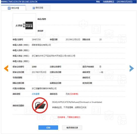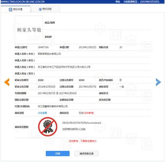 在中国商标网上公开查询到,敏华公司“头等舱”商标早已2010年5月被敏华公司注册,并广泛使用于全国各大门店,被广大公众所认知和认可。在查询过程中发现,顾家家居在2015年12月22日也申请注册了含有“头等舱”标识的商标“顾家头等舱”和“顾家家居头等舱沙发”,其中“顾家头等舱”被权益人注销,“顾家家居头等舱沙发KUKA”被商标局驳回。