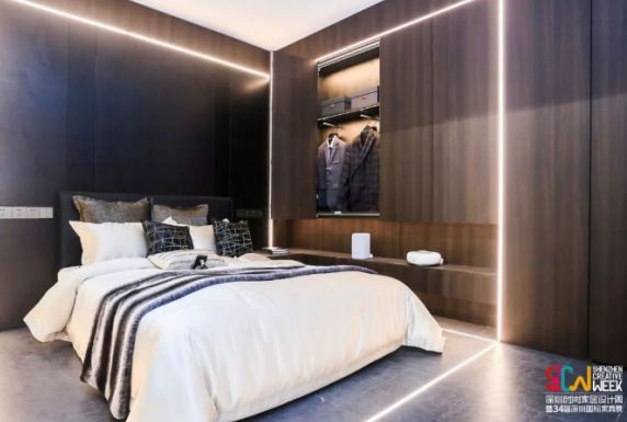 其中由ENJOYDESIGN创意总监郭捷参与主创设计的雅仕公馆——商务居屋,以黑色为主调色,LED灯带将居屋的各区域“切割”开来,非常酷炫;壁柜的暖黄色氛围灯,与床的颜色相呼应,增添了几分生活气息;玄关空间,利用镜面反射和LED灯带,营造出“迷宫”的效果,层次分明、科幻十足。“我们希望为城市精英以及新兴创业者等高收入人群打造一间全新的单身商务公寓,通过分析该类人群的生活习惯以及生活方式,构筑起属于一个人的轻松自在。”ENJOYDESIGN创意总监郭捷表示,希望通过雅仕公馆作品传递设计师对于商务人群的一种尊重。