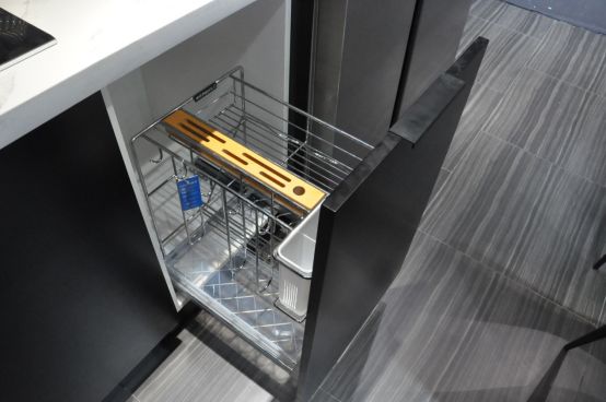 设计师利用现代收纳系统建立起厨房收纳地图,通过内置拉篮、碗碟柜大幅地提高了橱柜的收纳性,让厨房变得方便、整洁、赏心悦目。