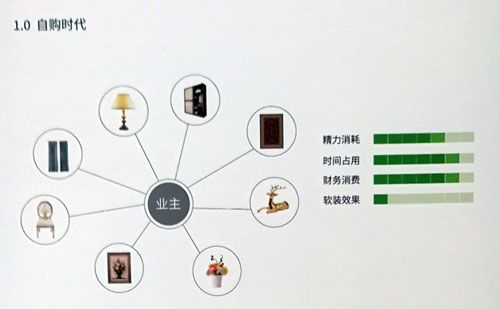 软装的1.0时代是自购时代,在那时,消费者至少要往返各类卖场之间20次以上,奔波历程600多公里,以北京的路况为例,最少也要堵车5个小时。他要走进至少60多家店铺体验,至少与30位销售员沟通,会听到至少15种活动促销,仅仅是决策的时间就需要100天左右!