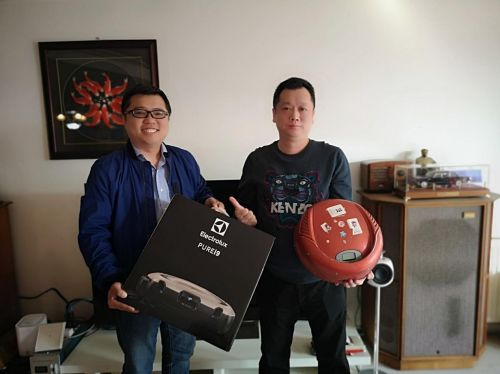 许先生是一位重度电器爱好者,家里陈列着的都是英国原装进口的发烧音乐。面对我们的到来,他显得有些拘谨,但跟田先生一谈起电器他的话匣子就打开了。说到“三叶虫”,他的记忆被拉回到了20年前。许先生向我们清楚的描述着当时遇到“三叶虫”场景:“我是跟我同事一起去的家电博展会,当时就看到它,在一个透明的玻璃台子上演示。非常好,看上去非常漂亮,沿着边缘清扫也不会掉下来。这当年是没有的,我也没见过,就觉得新鲜。当天我正好也带钱了,就立刻掏钱买了。这在当时就是黑科技啊,我买了我朋友也买了一台,不过他现在已经移民了。”田先生翻看机器后面的编号,告诉他“这是全世界第75台扫地机器人”,两人都显得很兴奋。许先生对机器的爱护程度可见一斑,甚至为机器贴了车膜。这台二十年前的“三叶虫”在精心爱护下依然像新的一样,颜色艳丽,只有上面贴着的2008年奥运福娃的贴纸在诉说着时间的逝去。许先生说这台机器一直用了差不多8年,期间到北京分公司维修过一次,后来搬家了也没有舍得扔,就一直保留到现在,连包装都留着。许先生从这台机器认识并了解了伊莱克斯,偶然间逛京东看到了新品发布的消息,点进去看到活动便立刻联系了品牌方。他说:“即便没有这个活动我也会掏钱买新品的,因为伊莱克斯东西好啊,我知道。”