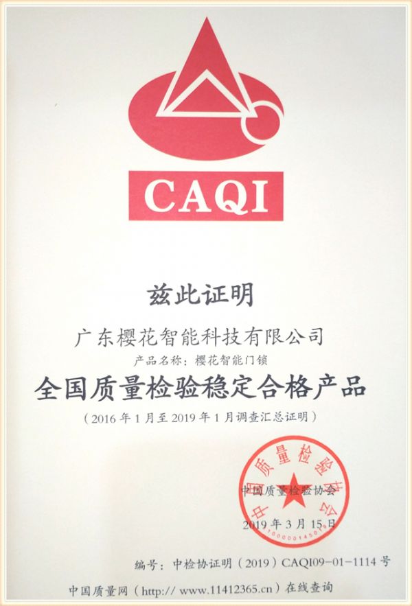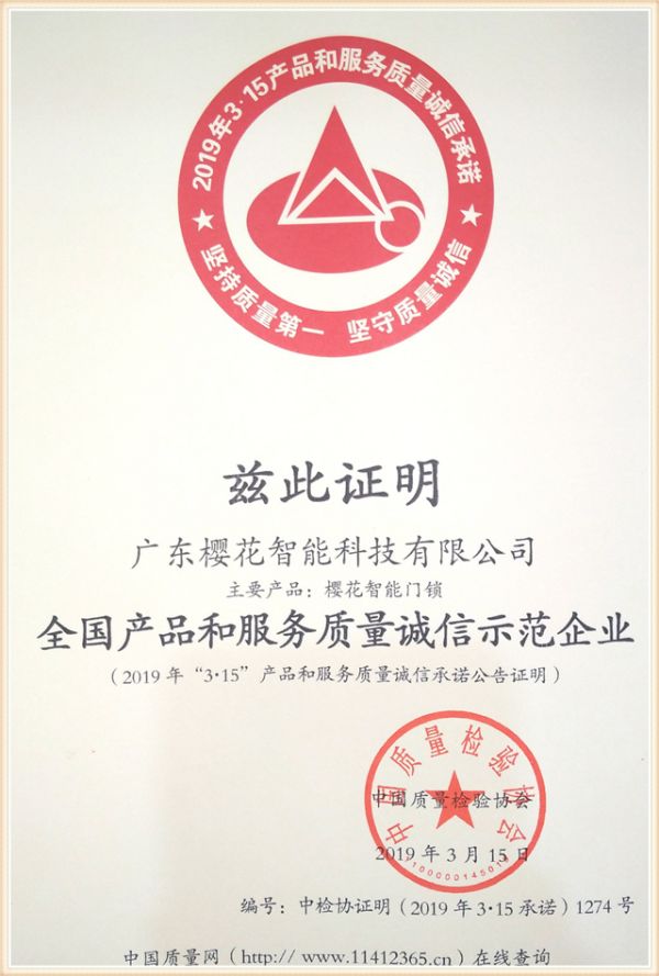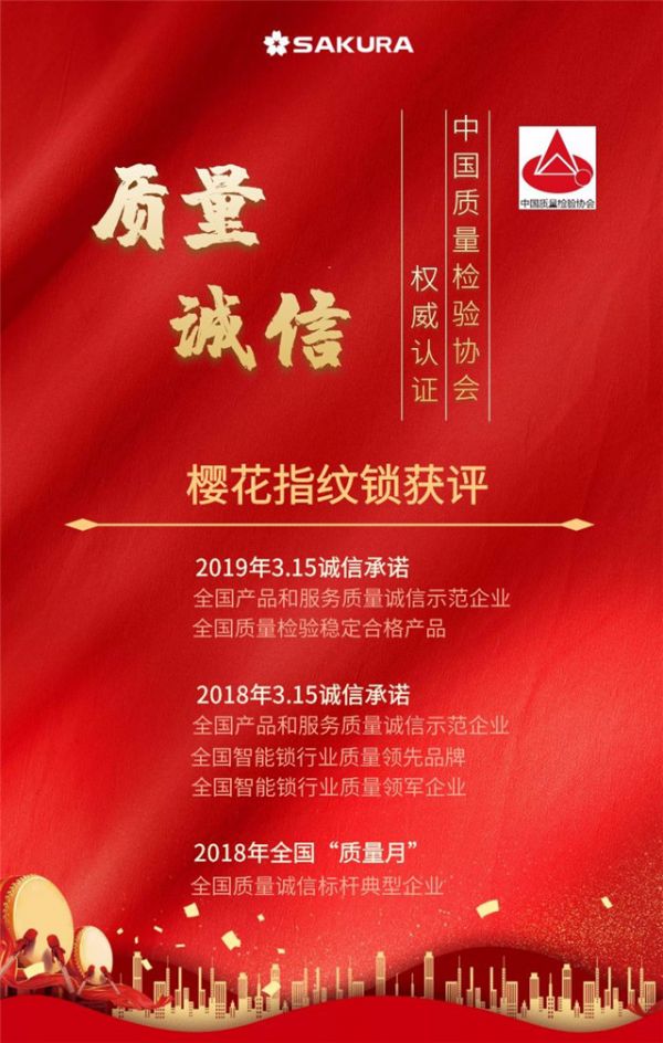 近日,由中国质量检验协会开展的2019年“3.15”国际消费者权益日“产品和服务质量诚信承诺”主题活动中,经过专业评委的严格审查和层层筛选,樱花指纹锁凭借高质量的产品和卓越的服务,荣膺“全国产品和服务质量诚信示范企业”和“全国质量检验稳定合格产品”双项殊荣。