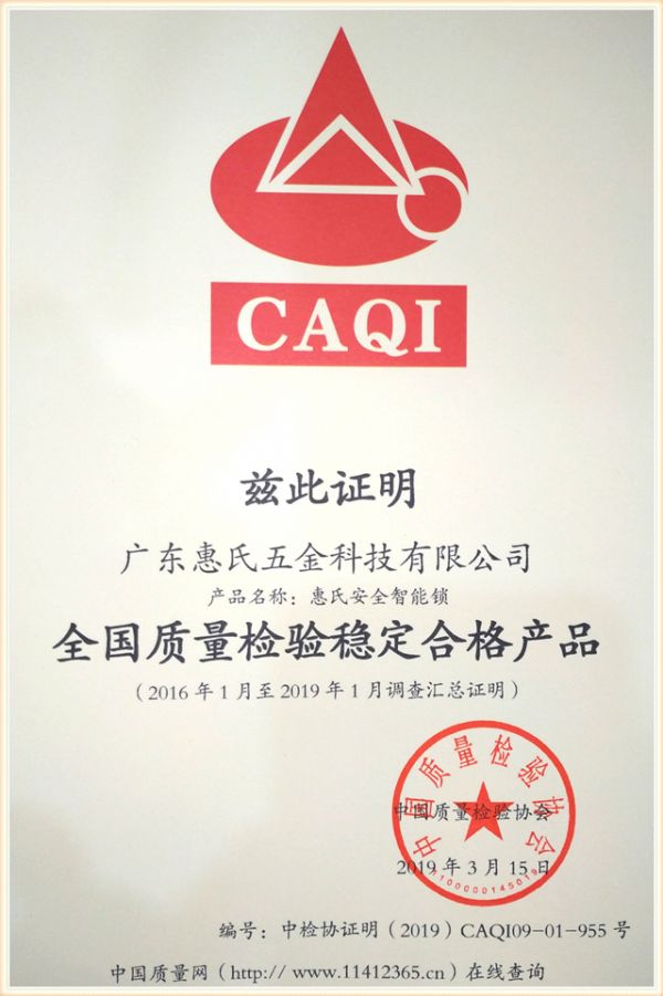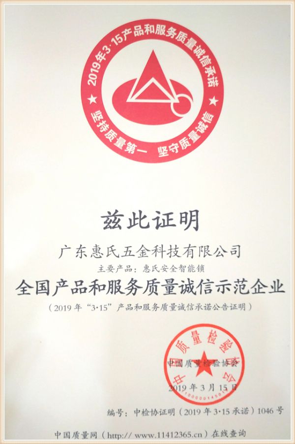 近日,由中国质量检验协会开展的2019年“3.15”国际消费者权益日“产品和服务质量诚信承诺”主题活动中,经过专业评委的严格审查和层层筛选,惠氏安全智能锁凭借过硬的产品质量和诚信的服务,继2018年荣获“全国质量诚信标杆典型企业”荣誉后,2019年又荣膺“全国产品和服务质量诚信示范企业”和“全国质量检验稳定合格产品”双项殊荣。