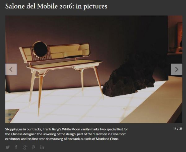 △ 2016年,J&A杰恩设计董事长、总设计师姜峰先生携作品“素月”亮相米兰国际家具展,用现代设计手法演绎具有传统韵味的家具,吸引了国内外媒体及意大利顶级家具品牌TURRI第四代继承人Andrea Turri的关注。