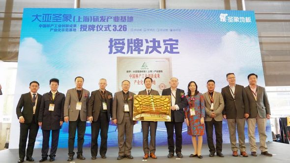 大亚圣象在研发创新方面的诸多举措得到行业领导的关注和帮助,2019年3月26日,中国林产工业协会认定大亚圣象(上海)研发产业基地为“中国林产工业创新成果产业化示范项目”,并由中国林产工业协会王满会长向董事长陈晓龙先生授予了奖牌。