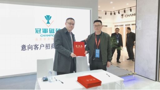 冠军磁砖本次展位通过匠心独运的整体设计,打造出一个时尚现代简约的展会场馆,吸引了众多客户观赏,引赞无数!现场举办招商会说明会,更是热情高涨,经过一系列精彩的沟通与分享,冠军磁砖强大的品牌实力、完善的招商政策和广阔的市场前景,得到广大来宾的高度认可和信赖,众多嘉宾热烈响应,纷纷上台现场立即签约,与冠军磁砖写下携手共赢未来的承诺。冠军磁砖诚挚邀请更多伙伴共创双赢,招商专线:400-887-2505