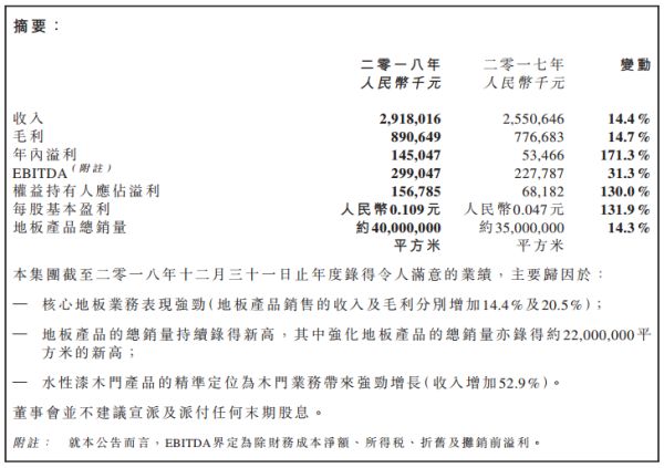 公告显示,该集团收入主要来自生产及销售地板及定制家装产品。地板产品为其核心业务,2018年地板业务营收23.88亿元,同比增长13.1%,占总营收81.85%。定制家装业务增长迅猛,2018年实现营收5.30亿元,同比增长20.5%,占据总营收18.15%,其中,木门业务实现52.9%的年销售增长,木门零售业务实现扭亏为盈。