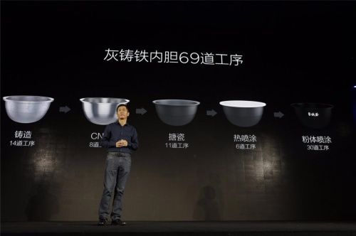 其它厂商不选择灰铸铁材质,成本高是一方面,另一方面是它的制作过程相当繁琐。从选择3.3 斤灰铸铁开始,经过14 道铸造开模,8 道 CNC 切削打磨,11 道搪瓷高温烧结,6 道热喷涂,30 道粉体喷涂,共经过69道工序打造纯米的“烈焰铁釜”内胆。烈焰铁釜广浅碗状的内胆设计与传统电饭煲圆形平底的内胆设计相比较,不仅在导热性上有了更大的突破,还在蓄热性、耐磨性、抗压性方面也都取得了不错的战果。