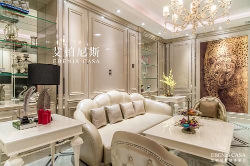 珍珠贝母漆大面积的使用,让家居空间在整体上更加华贵典雅,墙板在灯光下影影绰绰,营造了一种轻奢时尚的氛围。