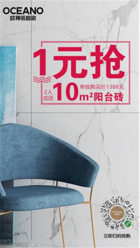 在门店体验产品选购,核销成功后并显示支付满5000元,即可2人拼团以1元获赠价值1388元10㎡卡森系列600木纹砖阳台砖。