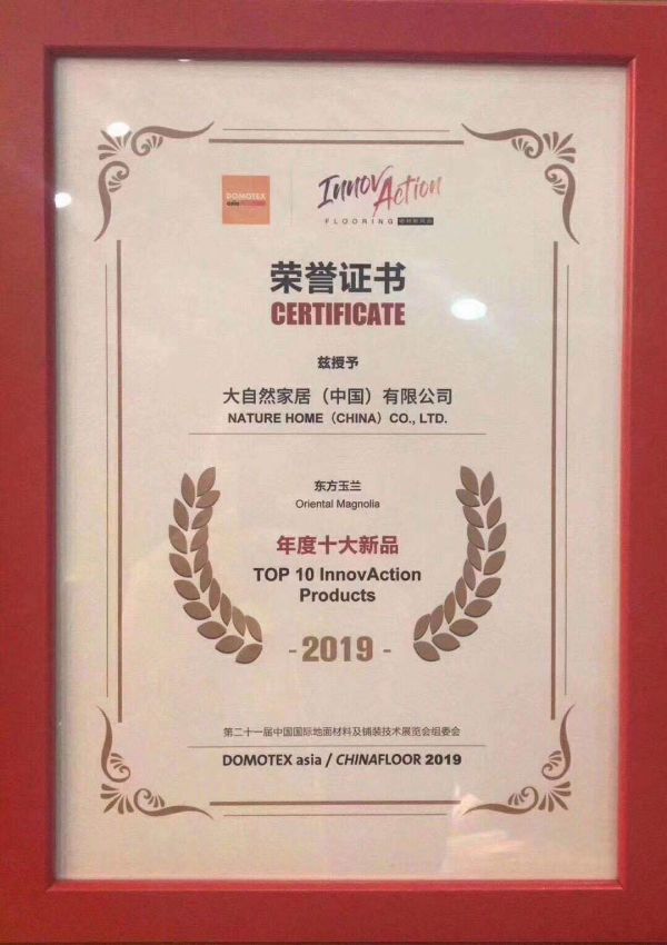 据悉,因产品在技术创新上的突出表现,大自然家居的地暖实木地板——东方玉兰在众多地材新品种脱颖而出,荣获2019地材新风尚 InnovAction《年度十大新品》奖。同时,大自然地板还获得了由中国林产工业协会实木地板联盟“中国匠心”奖。