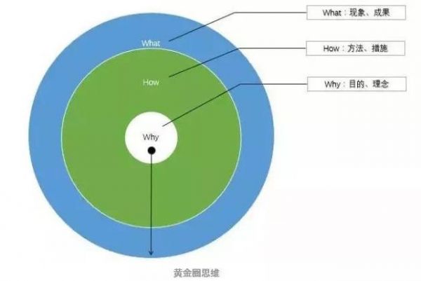 黄金圈思维:它是一种帮助我们透过问题的表象看到实质的思维方式。思考模式是先从(Why)出发,为什么要这么做,这么做的理念是什么,从内心激发出感性的情感,产生驱动力,近而再思考(How)如何做,设定目标一步步解决,最后做出来的结果就是(What)更加贴合最初的理念。