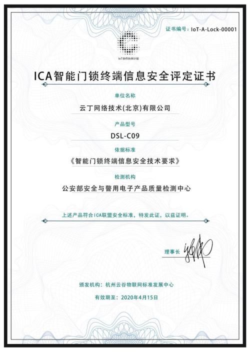 4月24日,杭州云谷物联网标准发展中心(ICA联盟)召开了2019年第一次安全标准组成员会议,并在会上重磅发布了物联网载体安全分级体系及智能门锁检测标准。凭借在安全性和用户交互方面的创新性设计,鹿客旗下智能锁DSL-C09(Touch2 pro)成为首款获得ICA智能门锁信息安全评定的门锁产品,为行业产品标准化树立了标杆。