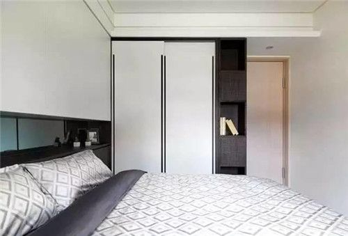 三间卧室,小编准备放到一起来讲,三间卧室也都采用了深浅相间的配色理念。主卧运用深浅不一的木纹呈现出拼贴效果,移动式的推拉门衣柜设计,非常有特点;次卧的深浅主要在空间和床上用品之间来表现; 黑白为主的父母房,床头设计是亮点,内陷式的收纳架,代替了床头柜,但置物收纳空间却比床头柜多得多。