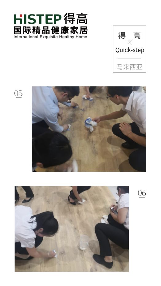 在了解Protect+技术相关知识之后,来自中国上海、青岛、成都等地的得高精英团队率先尝试在工厂对拥有新技术的Quick-step三层实木地板进行涂鸦“考验”,众人拿出蜡笔、颜料,甚至巧克力酱汁、番茄酱汁、咖啡、牛奶齐上阵,尽情画,尽兴泼,对地板进行了史无前例的大“造作”。