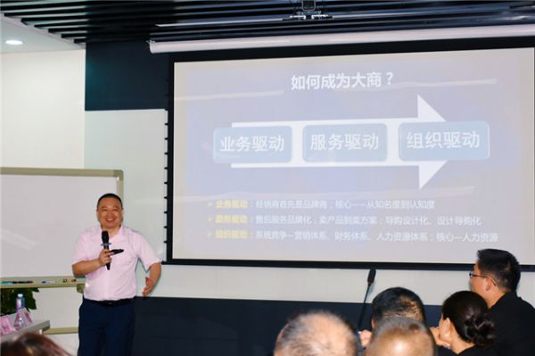 成立仪式上,首先由华帝家居战略合作方大显智业董事长刘学旦做《大家居浪潮下的大商新玩法》专题培训,他从2019年大家居环境、渠道变化、设计主导权、单品竞争、细分市场、大商驱动因素等维度阐述新环境下的大商玩法,为华帝家居大商养成指明了方向和道路。