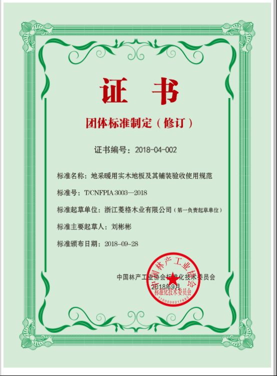 不仅如此,天格在领衔国标起草的同时,在中国林产工业协会、中国林科院木材工业研究所、浙江省地板协会等机构的大力支持下,再次负责起草《《地采暖用实木地板及其铺装验收使用规范》团体标准,和《地采暖用实木地板》浙江制造标准。团标在国标的基础上,增加了《铺装要求》、《验收规范》、《使用规范》和《保修期内质量要求》4项内容,填补国家标准在铺装规范方面的空白,有效规范铺装质量、保护用户的合法权益。而这一切,也来源于天格在其中作出的突出贡献。标准体系的打造,为地暖实木地板构建了一个良好的发展环境,标志着品类标准化时代的到来,也是品类快速成长的重要基础。