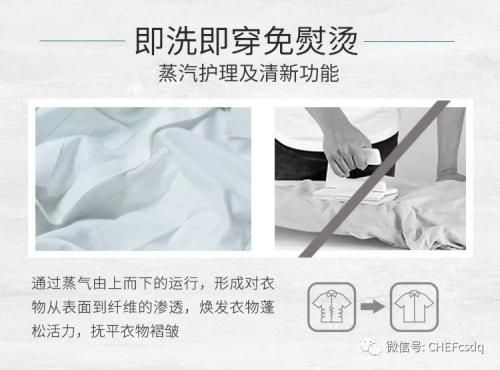 CHEF厨师CWW14113洗干一体机添加了蒸汽刷新技术和蒸汽护理功能,蒸汽刷新技术能存储蒸汽,洗涤程序结束后蒸汽对织物进行低温熨烫,有效减少织物褶皱,使衣物更具蓬松感,并去除异味,使衣物更清新;