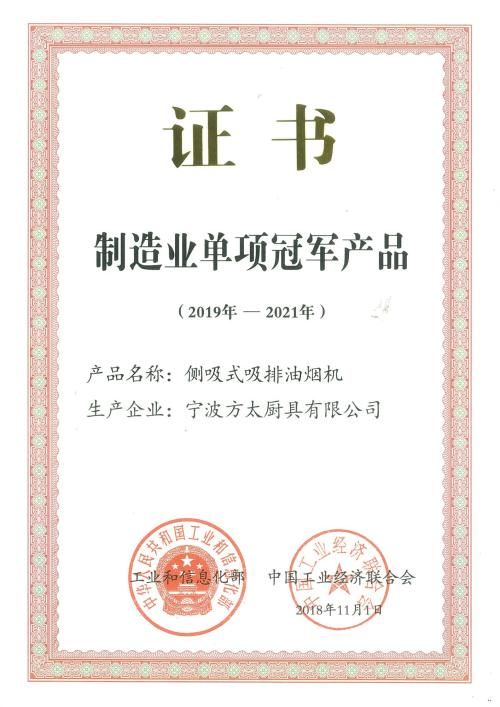 方太侧吸式油烟机被国家工信部评为“制造业单项冠军产品”