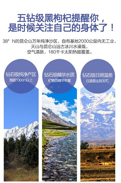 冻干黑枸杞采用保健品航天真空冻干技术,真空冷冻干燥,整个加工过程都是在真空低温条件下进行的,对黑枸杞热敏性营养成分无破坏,且没有氧气的参与,黑枸杞中的胡萝卜素、花青素等不会被分解,因而成品最大程度保存了鲜果的组织结构、营养成分和风味物质基本不变,保留鲜果99%精华。生理活性成分保持海绵状,因此复水性能好,食用方便,浸泡即可复原;重量轻,耐保藏,对环境温度没有特别的要求。每100克昆仑原生黑枸杞花青素含量到达到4.2克。