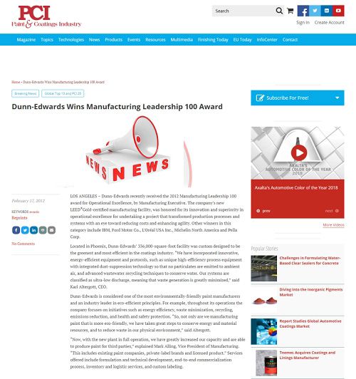 以下是美国邓恩涂料(Dunn-Edwards)2012年荣获制造业世界100强时《PCI》所发的新闻原文: Dunn-Edwards荣获制造业领袖100奖